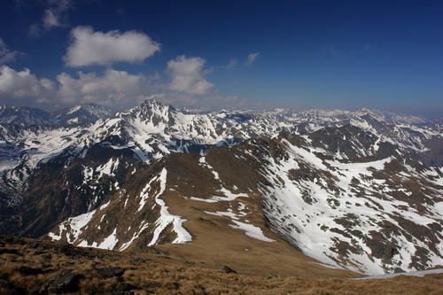 | Blick vom Gipfel über die Südwestflanke zur unübersehbaren Schoberspitze. Rechts davon der unscheinbarere Talkenschrein. |