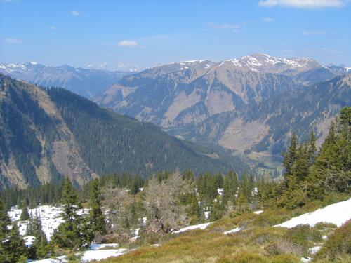 | ... und ein Tiefblick nach vorne zum Ausgangspunkt in Bildmitte. Abstieg zum Redlboden (links unten) ... |