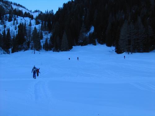 | Im Bereich der Hintergnadenalm. Einige Tourengeher sind kurz vor mir bei der Gnadenbrücke aufgebrochen. Die zahlreichen Spuren zeigen, daß die Route bis zur Südwiener Hütte ein sehr beliebtes Schitourenziel ist. |