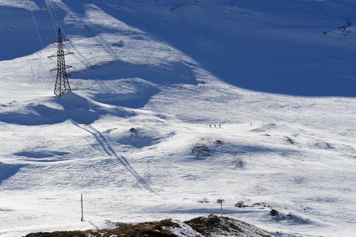 Eine 4-köpfige Wanderergruppe quert das Windsfeld.