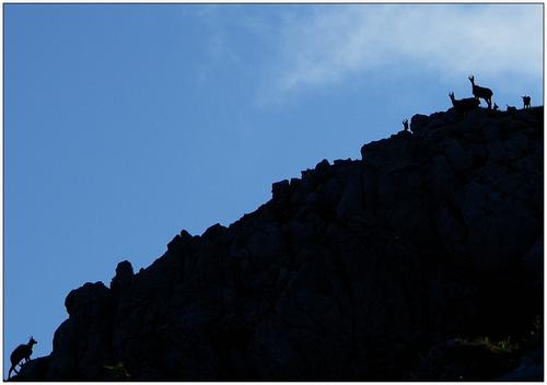 ... oder ein ganzer Rudel. Meist lassen mich die "coolen" Gämse bis auf ca. 10 Meter heran, erst dann weichen sie etwas aus, um den Sicherheitsabstand wieder herzustellen.