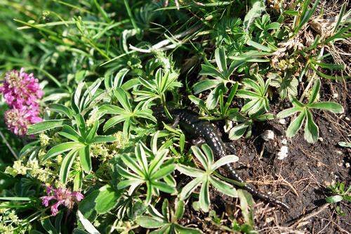 Ein Salamander entfleucht ins Gras.