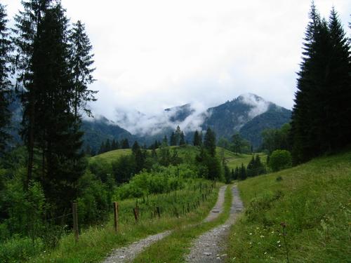 | Aber bereits nach kurzer Zeit zerstreute sich die aufkeimende Hoffnung. Die Wolken wurden wieder dichter. Auf Forst- und Almwegen führt der Weg zunächst Richtung Unterscheffau und über die Infang Alm weiter Richtung Schönaualm / Schatzl-Hütte. |