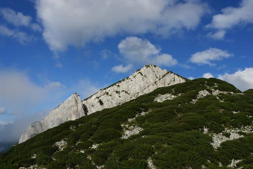 | ... erreicht man das Niedere Törl. Das Gipfelkreuz am Hoch-Törl winkt zwar verlockend herunter - ich fürchte aber, dann nicht mehr rechtzeitig im Hellen ins Tal zu kommen. Aber so bleibt wenigsten wieder ein nächstes Ziel. |