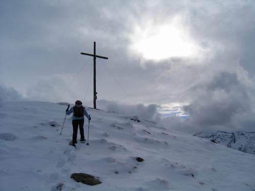 ... und Ingrid strebt dem kalt umwindeten Gipfelkreuz zu.