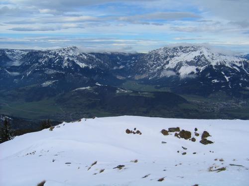 Die Hausberge Stoderzinken (links) und Kammspitz (rechts) über dem grünen Ennstal.