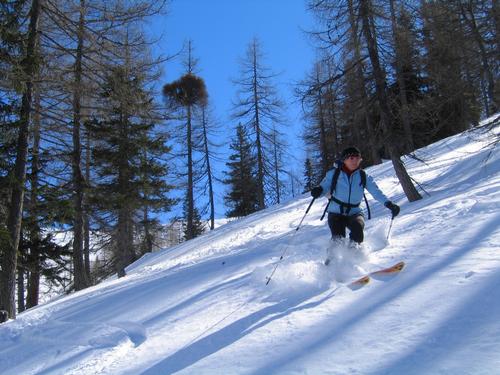 Nur im Wald oberhalb der Karteisalm treffen wir noch auf halbwegs brauchbaren Pulverschnee.