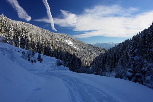 So folge ich zunächst einigen Schispuren, die vom Frommerkogel heruntergekommen sind, im Haslangergraben talauswärts.
