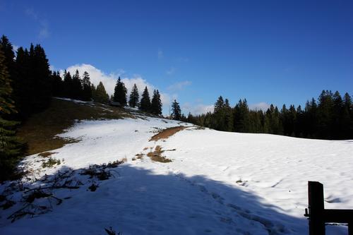 | Die Forststraße wird mehrmals durch den Wald abgekürzt. Bei einer freien Wiesenfläche verläßt man die Forststraße endgültig. Eine Tafel weist darauf hin, daß der Weg zum Leistenstein nur teilweise markiert ist. |