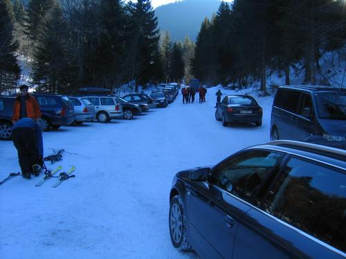 | Bereits beim Start zeichnet sich ab, daß die heutige Wanderung auf den Leobner keine einsame Schitour werden wird. Ebenso erstaunlich wie im letzten Jahr - wieviele Allradfahrzeuge es eigentlich gibt, denn die Auffahrt bis zum obersten Parkplatz oberhalb dem Gscheidegger-Hof ist nur mit Ketten oder mit Allradfahrzeugen erlaubt - und Ketten habe ich nirgends entdeckt. |