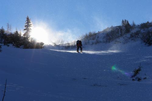 Ab der Grössingeralm leichter Wind - je näher man aber dem Leobner Törl kommt, umso heftiger wirbelt der Wind Schneefahnen vor sich her.