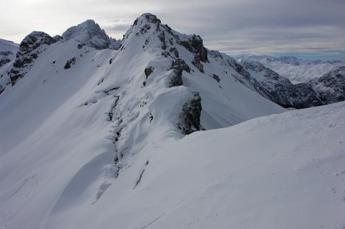 Die Scharte ist erreicht. Hier wird das Schidepot eingrichtet. Unterhalb des Grates Richtung Faulkogel sind einige große Anrisse erkennbar.