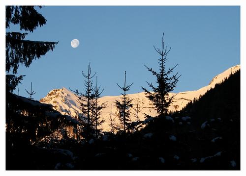 | Kurz nach dem Start beim Ghf. Burgstaller. Die aufgehende Sonne taucht die schneebedeckten Gipfel in oranges Morgenlicht. Der Mond möchte die Szenerie noch ein Weilchen genießen. |
