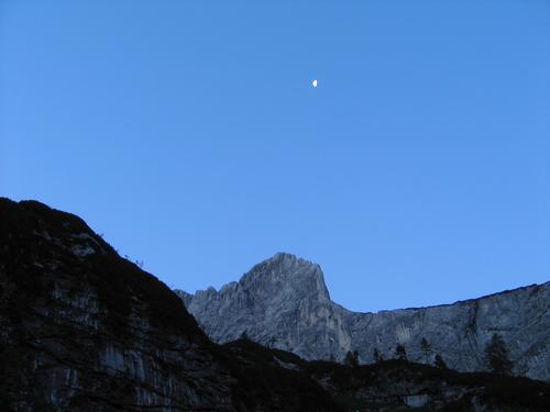 | Beim Start am Vorderen Gosausee war es noch recht dunkel. Dennoch war dank der gut sichtbaren Forststraße die Stirnlampe nur bei mancher Weggabelung vonnöten. Langsam aber wird es am Himmel heller. Dem Mond gefällt es aber so gut, daß er noch eine Zeitlang bleiben mag. |