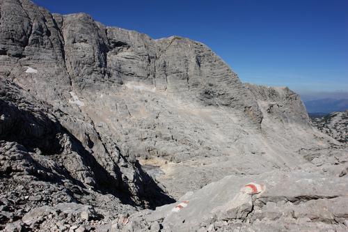 | Blick zurück zur langgezogenen Wand des Hoßkogels, an deren Füßen sich der Weg nördlich (im Bild rechts) und östlich (von rechts nach links am Wandfuß) entlangzieht. |
