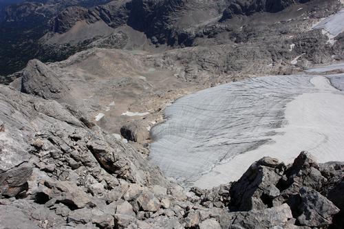 | Blick hinunter zum Ausläufer des Hallstätter Gletschers oberhalb der Simonyhütte, wo das geschulte Adlerauge auf den schwarz verschmutzten Gletscherspalten ein geparktes gelbes Schi-Doo erkennt (allerdings wirklich sehr winzig und kaum ausmachbar). |