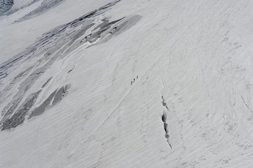 3 winzige Wanderer weichen einer großen Gletscherspalte aus.