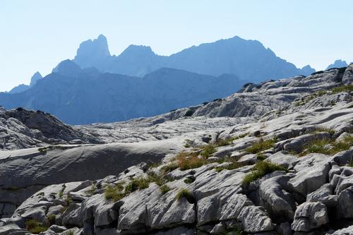 | Der Rückweg ist noch lang. Zuerst steuert man den Gosaukamm mit der deutlich erkennbaren Gr. Bischofsmütze an, danach heißt es noch, den Großteil des Gosaukammes nördlich zu umschreiten. |