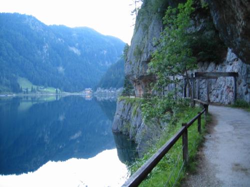 Am Vorderen Gosausee wird es zunehmend dämmriger. Eine schmale - für den Verkehr gesperrte - Straße schlängelt sich zwischen See und Felswänden entlang.