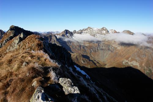 | Der Kessel mit der Keinprechthütte tief unter mir lag auch bereits in der Sonne. Darüber erheben sich die Gipfel um die Vetternspitzen und Sauberg (siehe Schneeschuhtour vom 27.12.2006). |