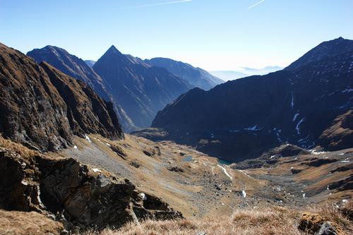| In der Scharte zwischen Rotsandspitze und Scharnock gelange ich endlich wieder in die Sonne. Im Schatten war der Weg stellenweise eisig. Blick über das Lantschfeldkar, aus dem einige kleine Seen heraufglitzern. |