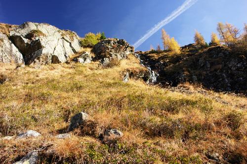 | In herrlicher Herbstlandschaft geht es ein langes Stück ziemlich eben über die Westflanken des Pietrach südwärts. |