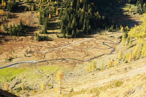 | 200 Höhenmeter unter mir der von mäandernden Bächlein durchzogene Almboden, über den die Zufahrtsstraße zur Keinprechthütte nach links hinaufzieht. |