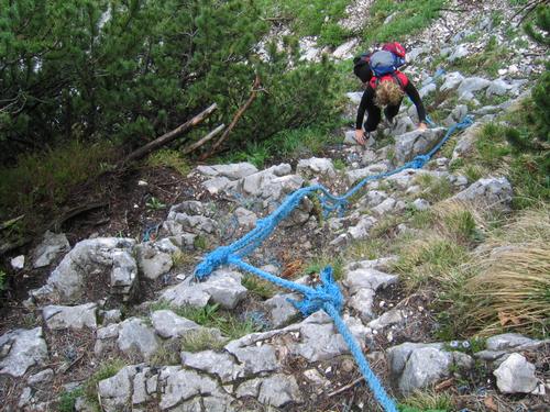 Eine kurze steinigere Passage wird mit Hilfe eines unterstützenden Seiles erstiegen.