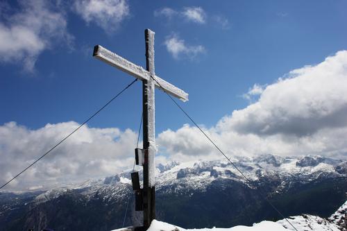 Beim Gipfelkreuz mit Ausblick auf den Dachstein.
