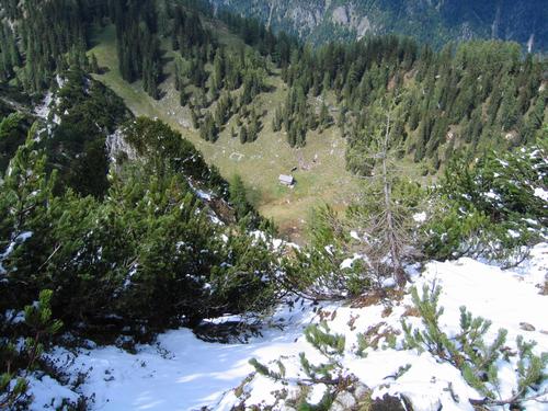 | Beim Abstieg nach Norden zu einer kleinen Almhütte - der Schnee sowie der erdig-rutschige, schuhsohlenprofilverstopfende Schlamm erfordern im steilen Gelände Konzentration und Vorsicht. |