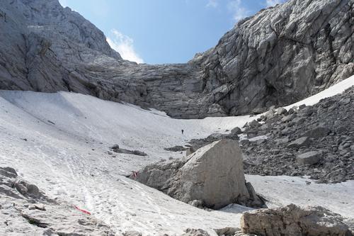 | Im oberen Bereich über einige größere Schneefelder - in Bildmitte befindet sich gerade ein Wanderer im Abstieg. Die folgende Felsstufe wird mittels Sicherungen (Drahsteile, Eisenleitern) überwunden. |