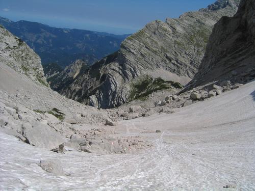 Blick über das Schneefeld hinunter Richtung Welser Hütte (rechts der Bildmitte auf dem grünen Fleck).
