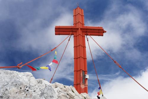 Das Gipfelkreuz ist erreicht. Ein großes, ein wuchtiges, ein rotes Kreuz.