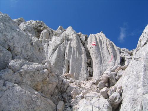An einigen Stellen nimmt man bei der Turnerei über den scharfen Fels, über Spalten und an Dolinen vorbei, die Hände zur Hilfe.