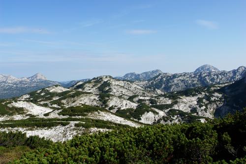 Nördlich liegt das weitläufige, latschgengesäumte Hochplateau, über das man das Albert-Appel-Haus erreichen könnte. Rechts hinten die runde Kuppe des Großen Woising.