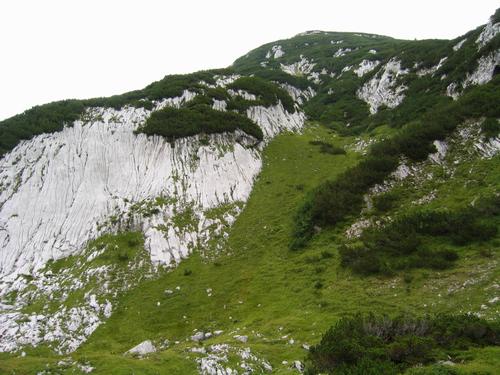| Mit etwas Müh und Not und Abschürfungen finde ich eine halbwegs brauchbare Gasse in den stellenweise über 3 Meter hohen Latschen. Über diese Wiese kommt man schließlich wieder auf den markierten Weg, der vom Grundlsee - am Backenstein vorbei - zum Albert-Appel-Haus führt. |