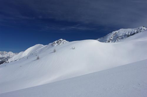 In allen möglichen Weißschattierungen leuchtet der Schnee vor einem zunehmend tiefblauen Himmel.
