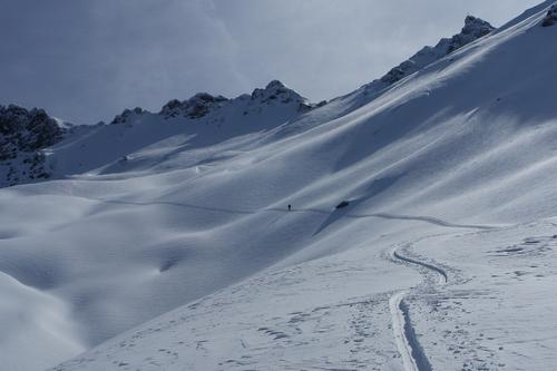 Ingrid - ein kleiner Punkt im weiten Kar, das zuletzt etwas mehr aufsteilt.