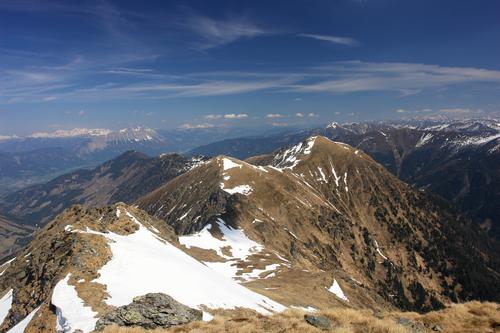 | Die nächsten Nachbarn im Nordosten: Schusterstuhl und Spateck. Links in Bildmitte der Kochofen und dahinter der Grimming. Links, ganz im Hintergrund, die schneebedeckten Gipfel des Toten Gebirges. |