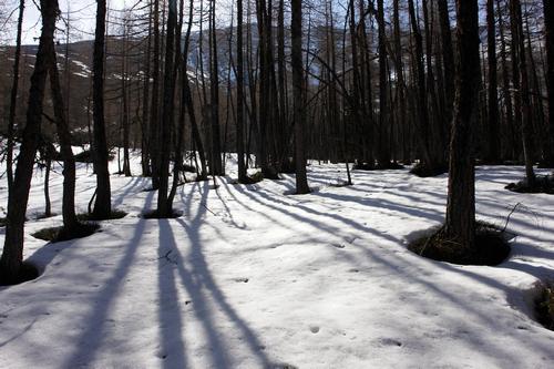 Hier beginnt nun die geschlossene Schneedecke - der harte und meist tragfähige Harschdeckel am Vormittag erlaubt es uns, die Schneeschuhe am Rucksack zu lassen.