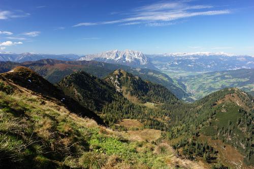 | Wieder ein Blick talauswärts. Der Taleinschnitt, der von Irdnung nach Donnersbach (und weiter nach Donnersbachwald) hereinzieht. Rechts im Hintergrund das Tote Gebirge. |