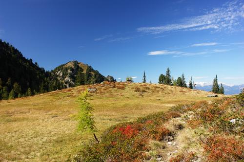 | Der Abstieg vom Tattermann gestaltet sich auf Grund der im Schatten liegenden, steilen Nordflanken etwas rutschiger. Schließlich aber schreitet man über mehrere nahezu ebene Wiesen- und Waldetagen tiefer. |