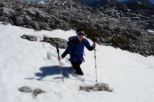 | Abseits der Wanderwege heißt es vorsichtig sein. War am Morgen die Schneedecke noch gefroren und tragfähig, wurde sie in der mittäglichen Wärme zunehmend weicher. Ein Einsinken bis über die Knie war keine Seltenheit. |