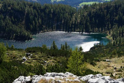 Das Gelände wird nun ungefährlicher, das Grau der Felsen weicht dem Grün der Wälder um den Steirersee.