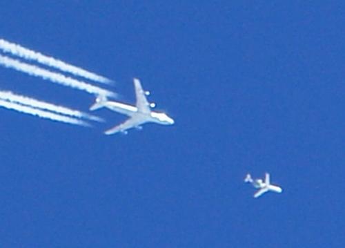 ... erst als es sich nach einigen Minuten aus dem "Windschatten" lösen kann, wird im Zoom-Blick ersichtlich, daß da 2 Flugzeuge in unterschiedlichen Höhen wohl das gleiche Ziel anpeilen.