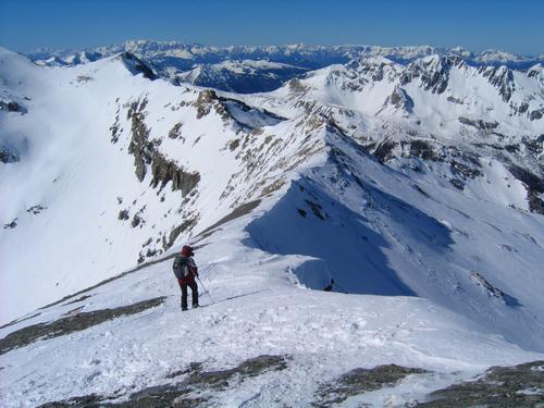Bereit zur Abfahrt - von der Wächte in den schattigen Bereich nach rechts hinunter.
