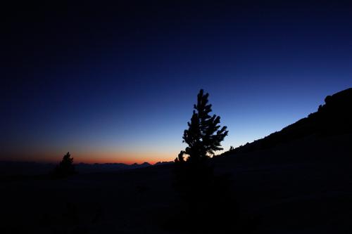 Der Himmel färbt sich in dunklem Blau, am Horizont ein schmaler oranger Streifen.
