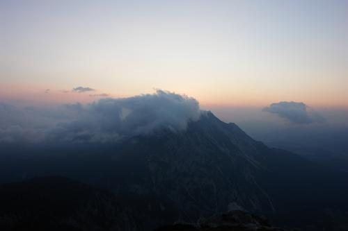 | Rechtzeitig vor Sonnenaufgang stehe ich am Stoderzinken. Der angekündigte Wetterumschwung zeigt sich an Hand der von Norden hereindrängenden Wolken, die sich am Kammspitz stauen. Zudem treibt der eisige Wind immer wieder in rascher Abfolge Wolkenfetzen über den Gipfel. |