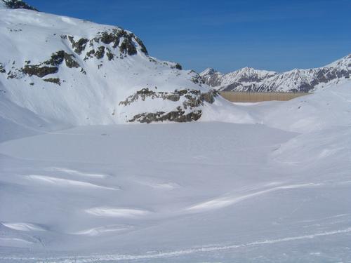 | ... wo gerade eine größere Gruppe links der Bildmitte eine Pause einlegt. Laut Experten ist die Querung des See´s nicht ganz unbedenklich - durch Ablassen des Stausee´s können sich zwischen Eisschicht und Wasseroberfläche Lufträume bilden, die bei ungenügend ausreichender Eisdicke einbrechen könnten. |
