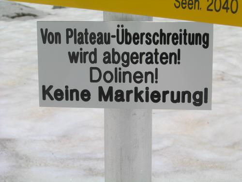 Vor dem weiteren Eindringen in das dolinenreiche Karstplateau wird gewarnt.